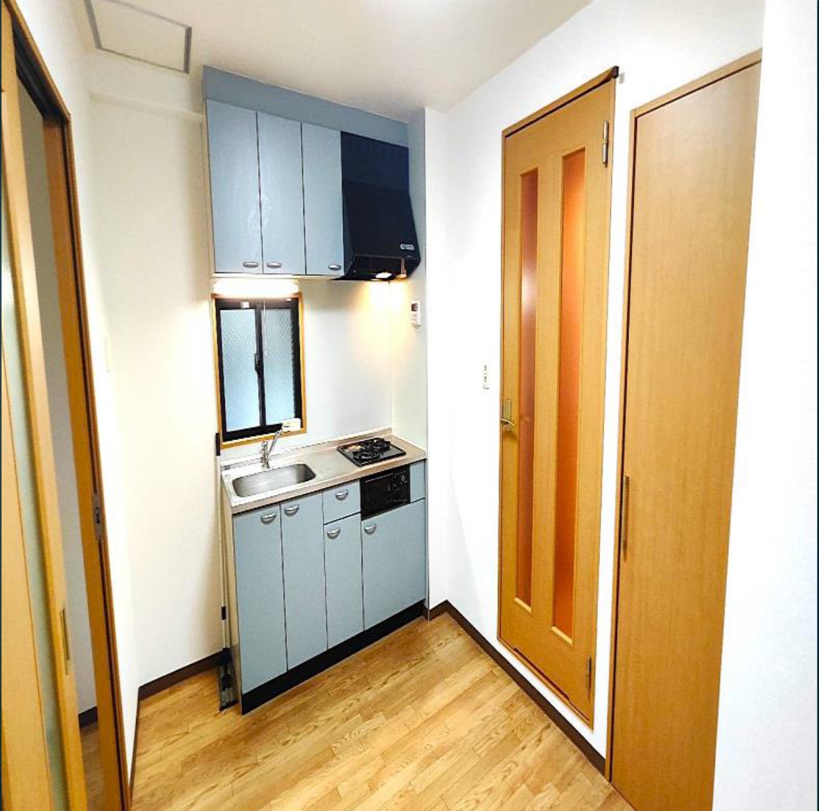 ライトブルーのキッチンは、やわらかな空気感と清潔感を併せ持ち